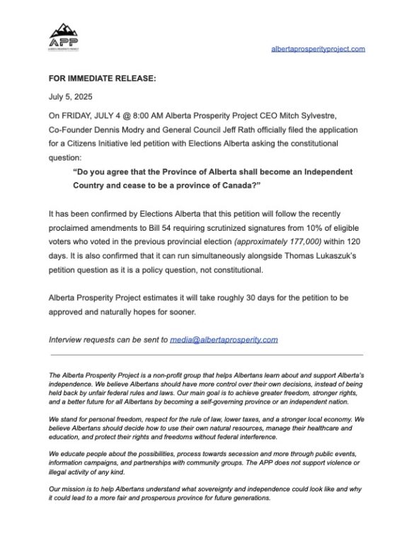 On FRIDAY, JULY 4 @ 8:00 AM Alberta Prosperity Project CEO Mitch Sylvestre, Co-Founder Dennis Modry and General Council Jeff Rath officially filed the application for a Citizens Initiative led…