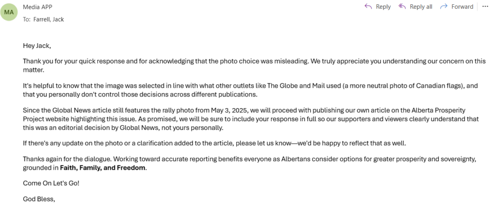 We immediately contacted reporter Jack Farrell to raise our concerns and request a correction. Jack responded promptly and transparently, noting that the photo choice was made by Global News editors (not him) and acknowledging it was misleading. He pointed out that other outlets, such as The Globe and Mail and CBC, used more neutral imagery.