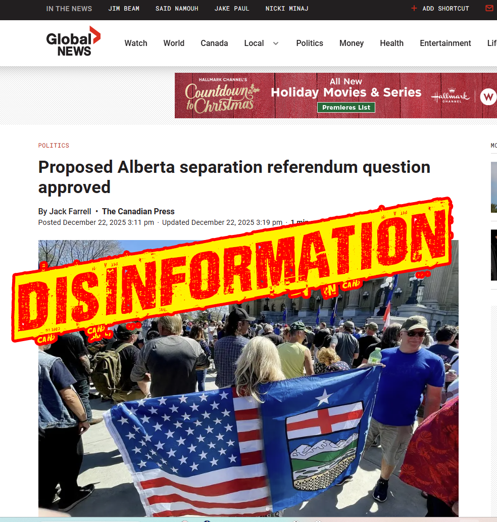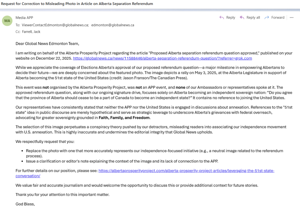 Great news, fellow Albertans! Following our outreach and formal request for correction, Global News has quietly replaced the misleading photo in their December 22, 2025 article “Proposed Alberta separation referendum question approved”.